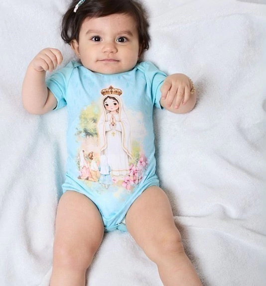 ✨ Vista seu pequeno com amor e proteção com o Body Infantil Nossa Senhora de Fátima. Confeccionado em tecido super confortável e delicado, ideal para a pele sensível dos bebês.
